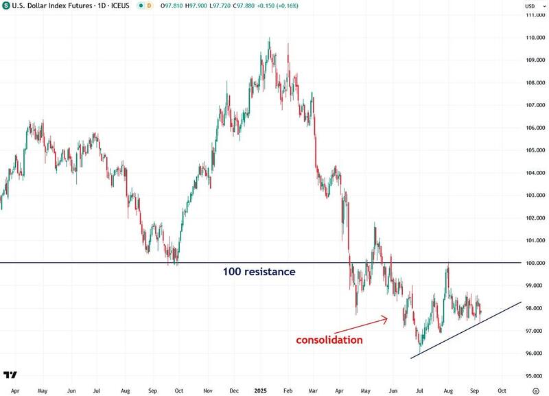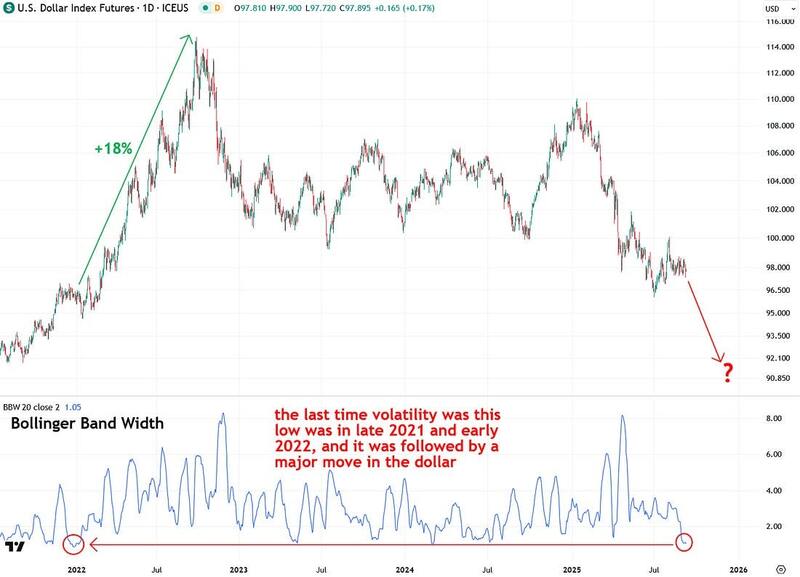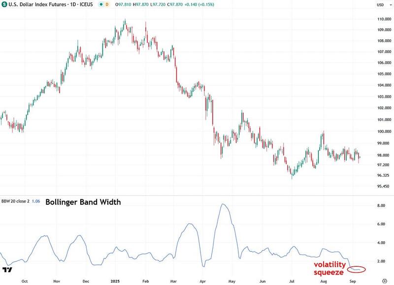 Not only is the U.S. Dollar Index currently in a volatility squeeze, but it is experiencing one of the most extreme squeezes in recent years. You have to go all the way back to early 2022 to find a comparable example.