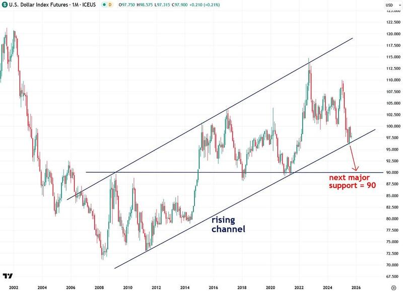 I believe a breakdown from this channel, which could happen very soon, would be a key signal that the dollar is entering a new bear market, similar to the one that took place in the early 2000s.