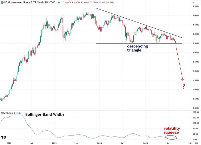The chart below shows the U.S. 2-Year Treasury Note yield, which has formed a descending triangle pattern. This is typically a bearish setup and is occurring at the same time as a volatility squeeze, both of which indicate that a significant move in interest rates is likely.